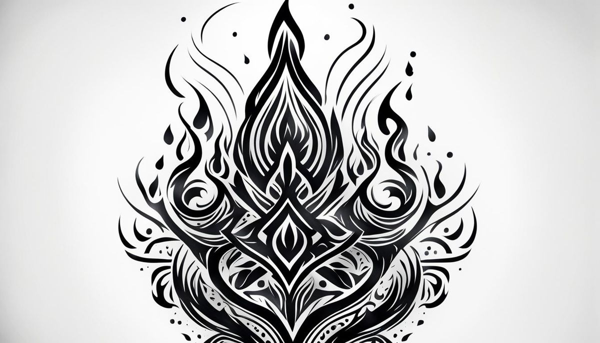 This image shows a set of minimalist black flames on a white backdrop, in a retro tattoo art style. The design features bold lines and geometric tribal patterns, with a high-resolution, vector-style aesthetic.