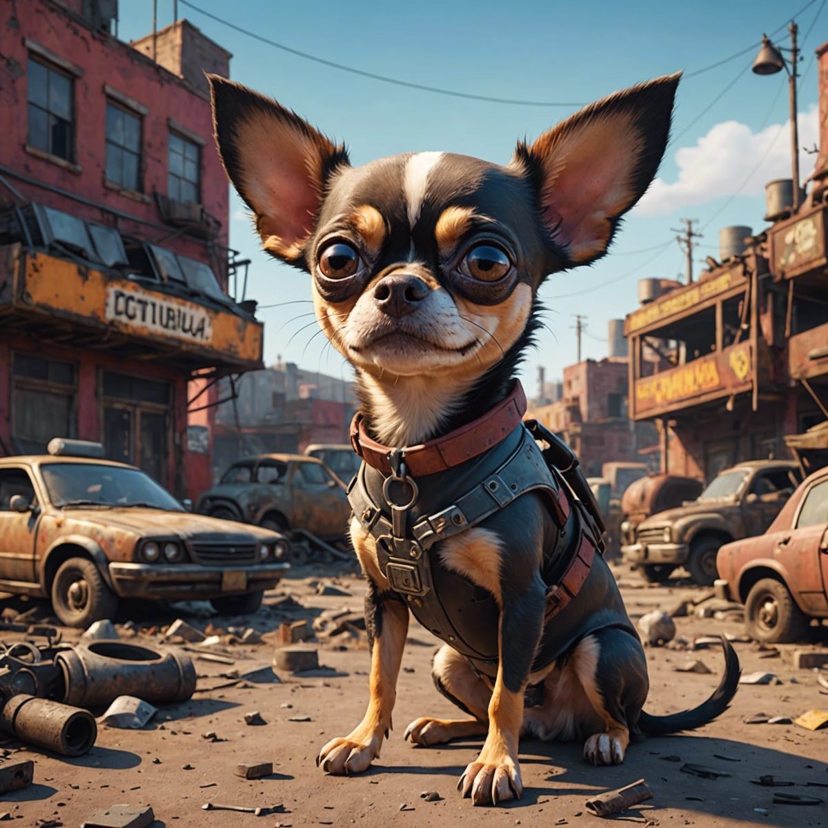 This image shows a post-apocalyptic junkyard scene featuring a hairless Chihuahua and a fat cat. The scene is rendered as 3D digital art with bright colors and a radial gradient background.