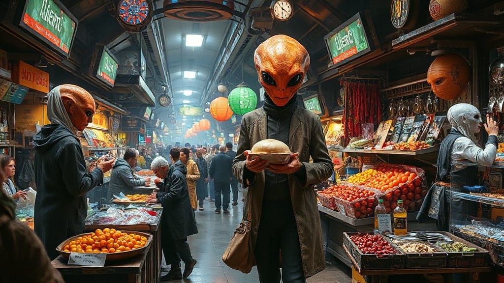 A busy alien market scene filled with merchants and shoppers. The market features exotic produce, unusual foods, and mysterious gadgets in a zero-gravity bazaar, with a hyper-realistic, maximalist aesthetic.