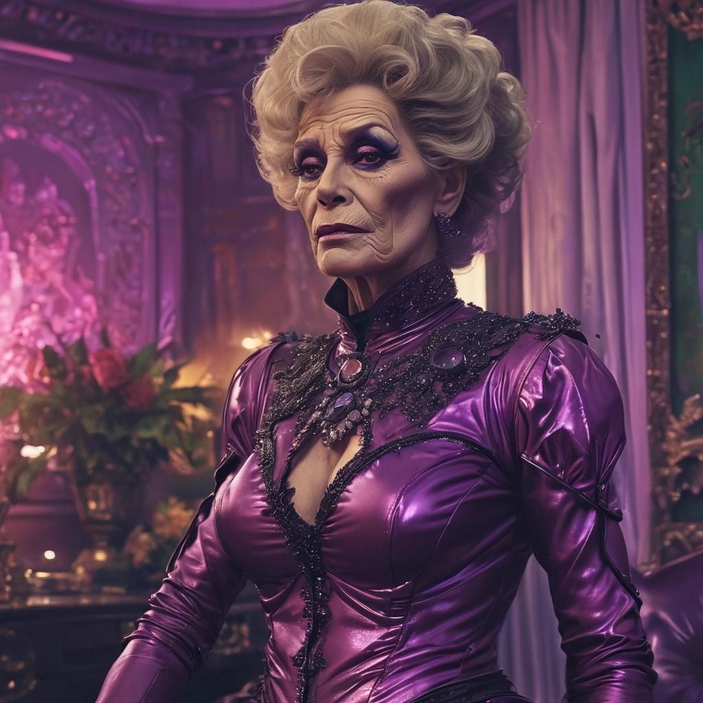 This image shows an older person with makeup dressed as Barbarella in a sci-fi setting. The vibrant, highly detailed scene features purple and green neon, iridescent fabrics, and retro-futuristic textures as 3D rendered digital art.