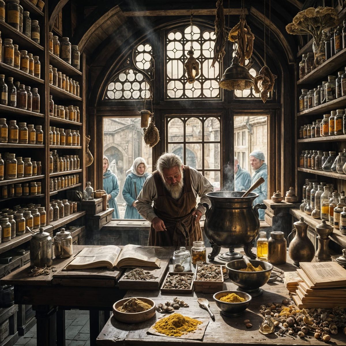 This image shows a medieval apothecary in stunning detail, with intricately arranged shelves, brewing potions, and a bustling street scene through a dusty window.