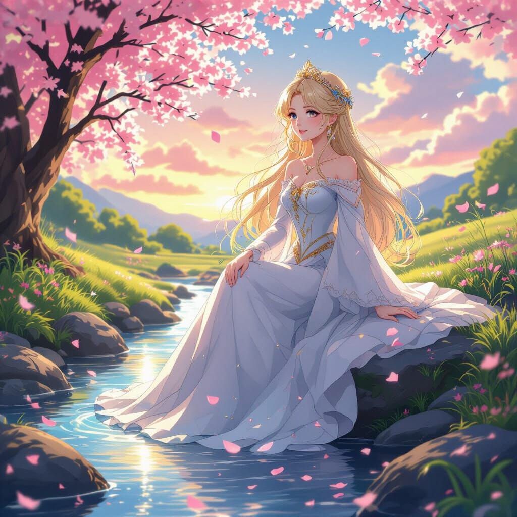 A vibrant anime-style portrait of a beautiful princess with long blonde hair and sparkling eyes, seated on a rock by a glowing stream. Cherry blossoms and lush greenery add to the dreamy, sophisticated aesthetic.