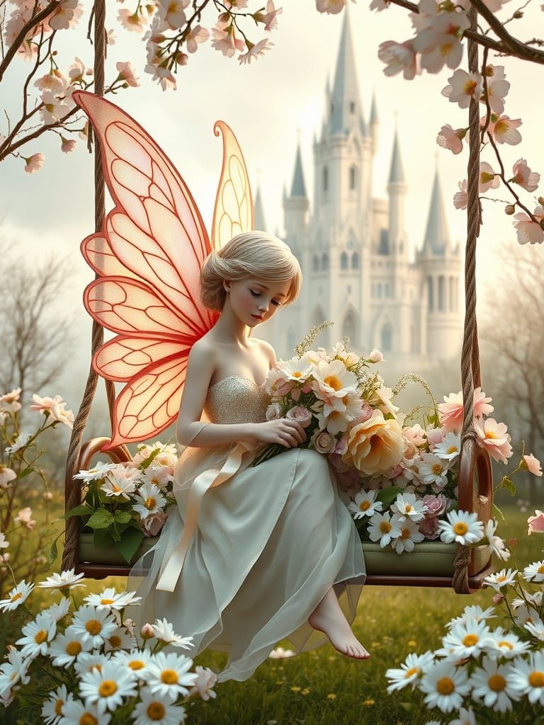This enchanting image depicts a serene Easter fairy surrounded by lush cherry blossoms and white daisies, evoking the dreamy quality of classic Pre-Raphaelite art with delicate, porcelain skin and intricate, iridescent wings.