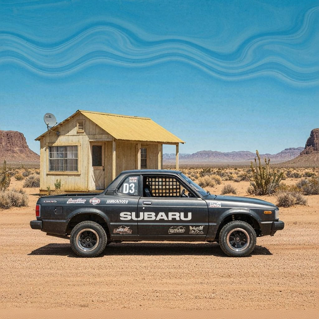This image shows a modified 1978 Subaru Brat pickup truck, converted for Baja racing, parked near a small desert house. The artwork has a surreal, melting aesthetic.