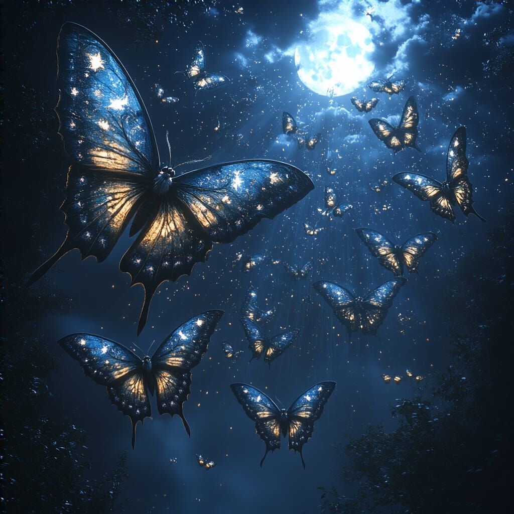 A swarm of moonmoths with shimmering, star-field patterned wings fills a dark, fantastical night sky. Rendered in hyperdetailed concept art with dynamic lighting.