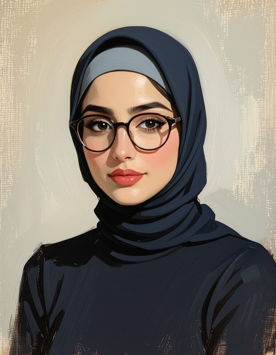 This image shows a head and shoulders portrait of a beautiful woman wearing a hijab and glasses. The style evokes the loose brushwork of impressionist oil paintings.