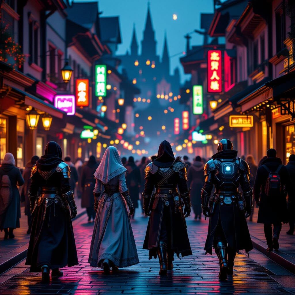 This photorealistic image captures a city street at dusk where medieval and cyberpunk styles merge. Neon lights and torchlight create a dynamic chiaroscuro effect, highlighting detailed textures and a sense of depth.