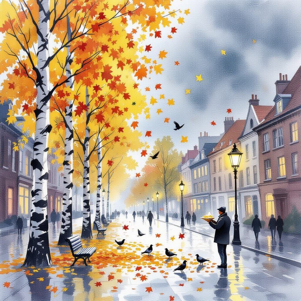 A watercolor painting silver birches in Autumn dropping leaves, blowing left to right, in tree lined street, old market square, pigeons, man feeding birds, old lampposts illuminated. Ominous sky, yellow birds The painting has a rustic and serene feel, with visible brush strokes and muted tones