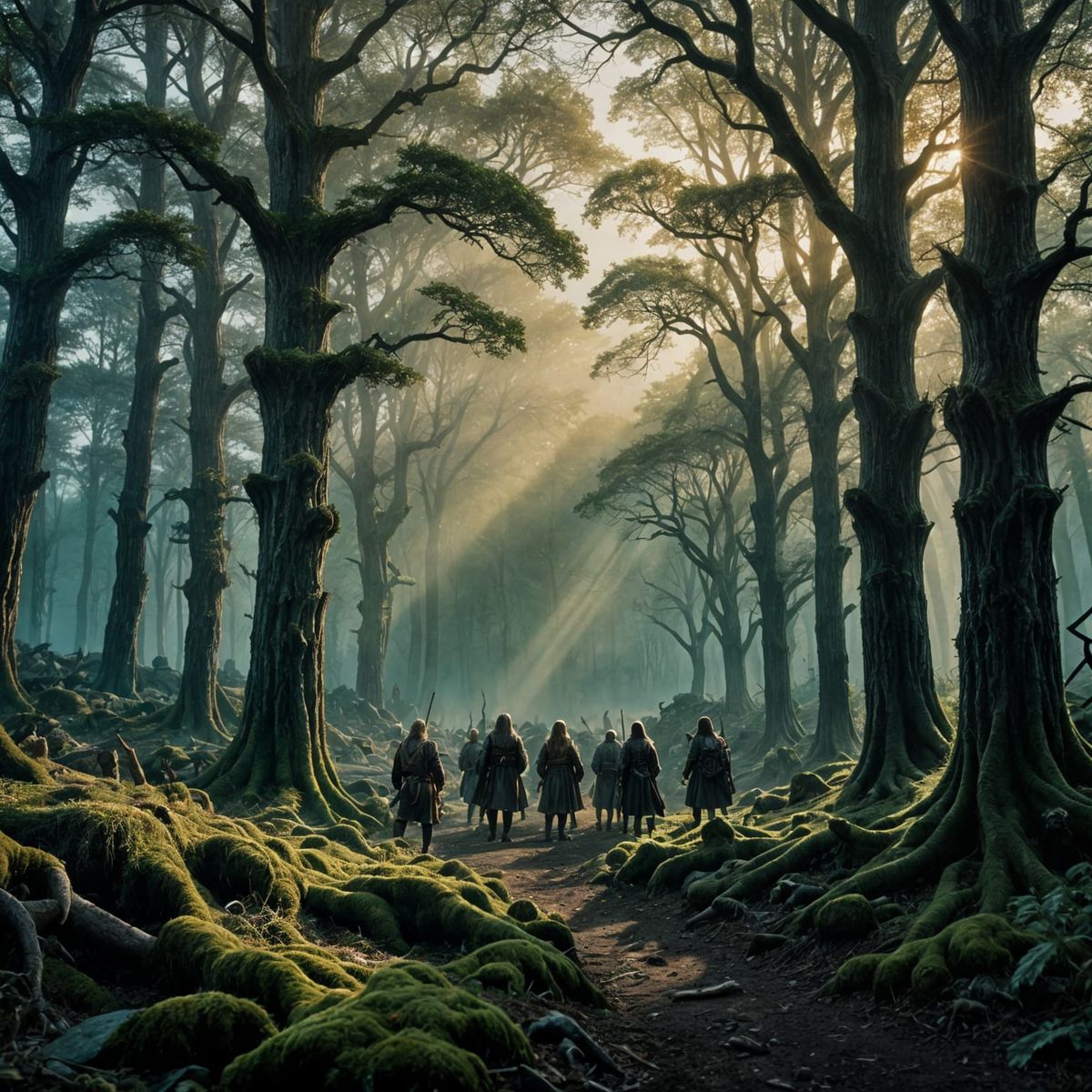 This image depicts a breathtaking medieval Viking city nestled deep within a dark wood forest. The scene is rendered in meticulous detail, with cinematic lighting and a rich color palette that evokes a sense of drama and atmosphere.