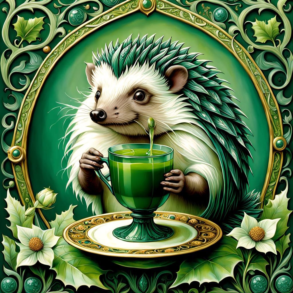 This Art Nouveau image features a hedgehog in British racing green, enjoying green tea. It showcases intricate, otherworldly patterns and emerald hues in a vivid green palette.