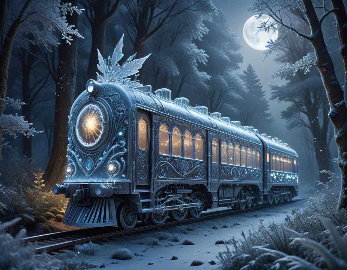 This image shows an ornate crystal train adorned with fairy lights, journeying through a frosted forest under a full moon, rendered as a highly detailed digital painting with intricate motifs.