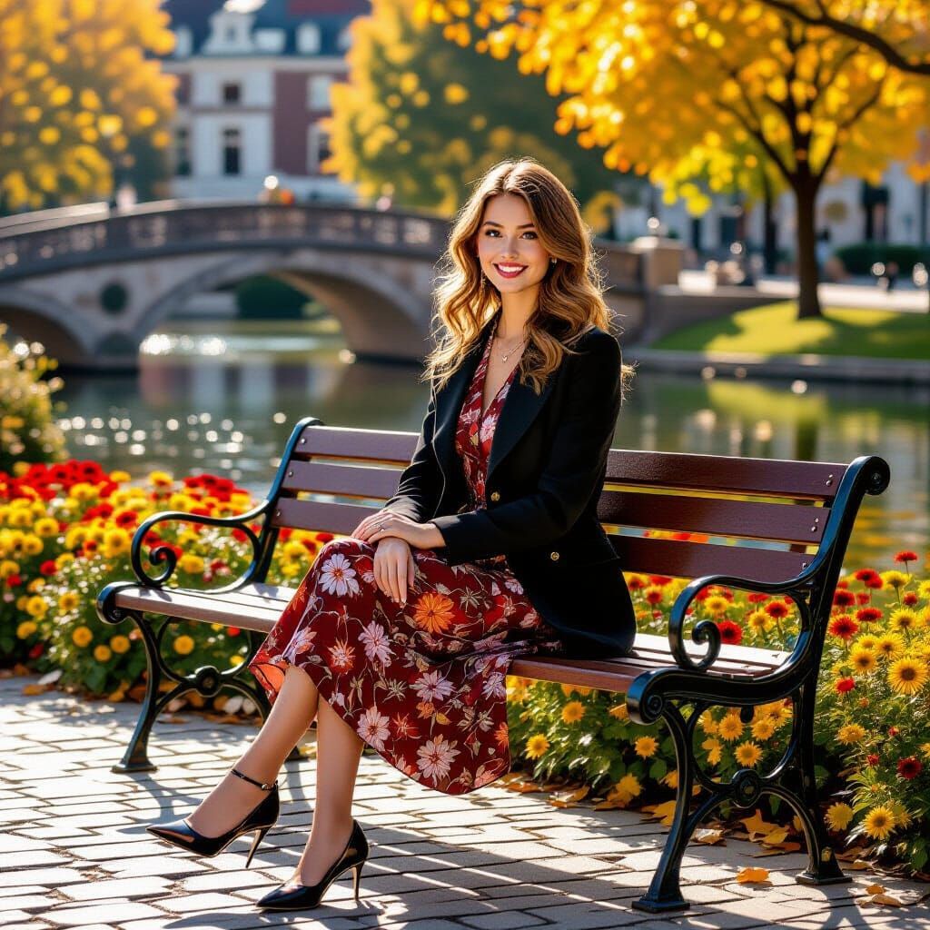 A slender girl with red wavy hair smiles by an old town pond, featuring a stone bridge and autumn foliage. The scene captures a serene park setting with vibrant colors.