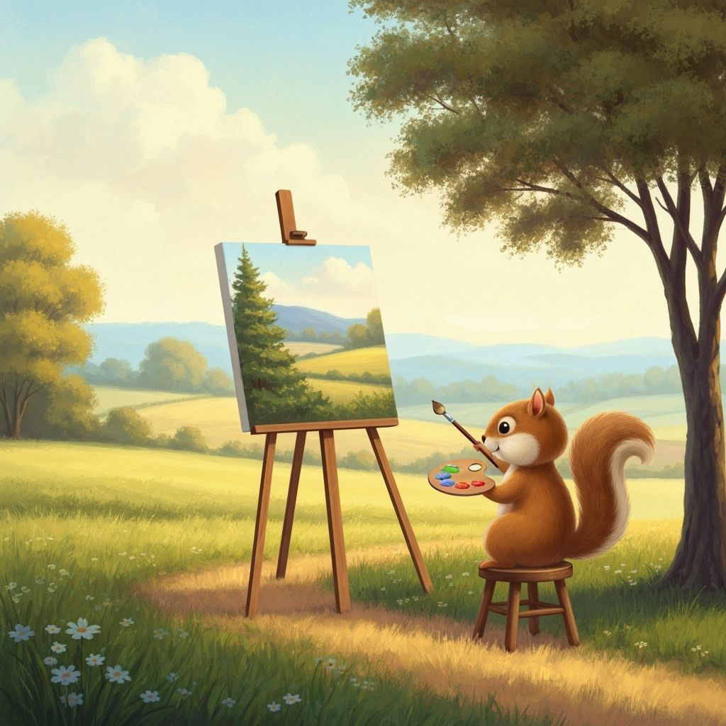 This image shows a cartoon squirrel painting a landscape in the countryside. The style is reminiscent of classic Bob Ross, with soft colors and gentle brushstrokes. The scene is calming and inspiring.