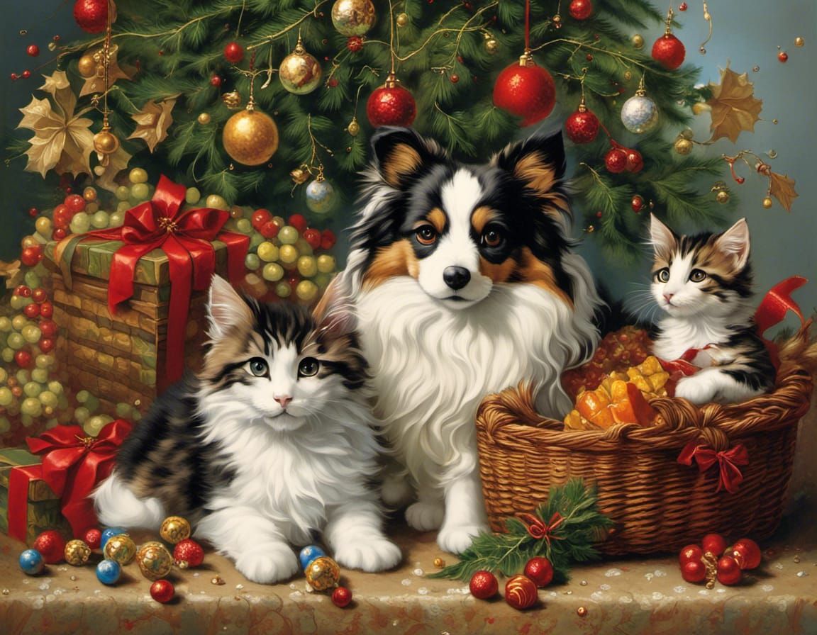 This image shows cats and dogs enjoying their first Christmas together under a tree. The portrait captures dynamic lighting and intricate details in a trending art style.