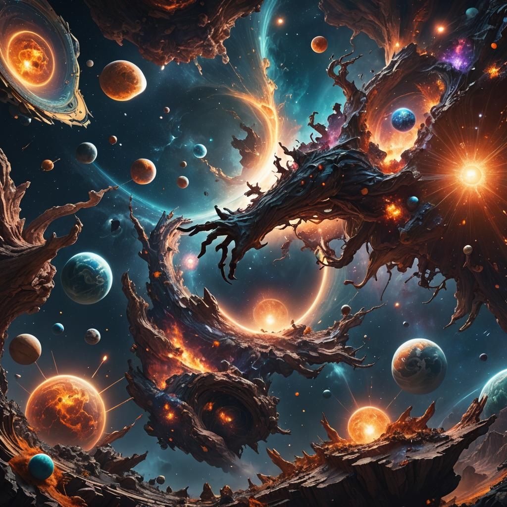 A fantastical and deeply colored matte painting of the universe's creation. The image features intricate details and complementary colors, rendered as unreal engine fantasy concept art.