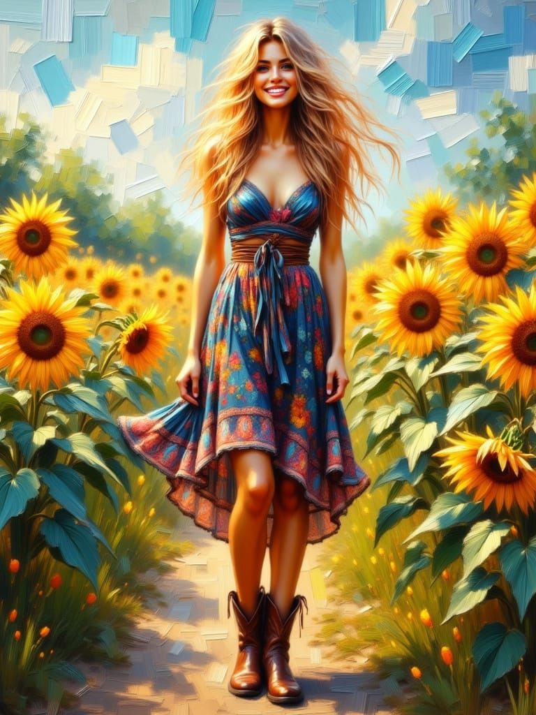 This image features a lovely blonde woman in a vibrant field of sunflowers, wearing a flowy sundress and cowboy boots, surrounded by the warm, naturalistic atmosphere reminiscent of American folk art.