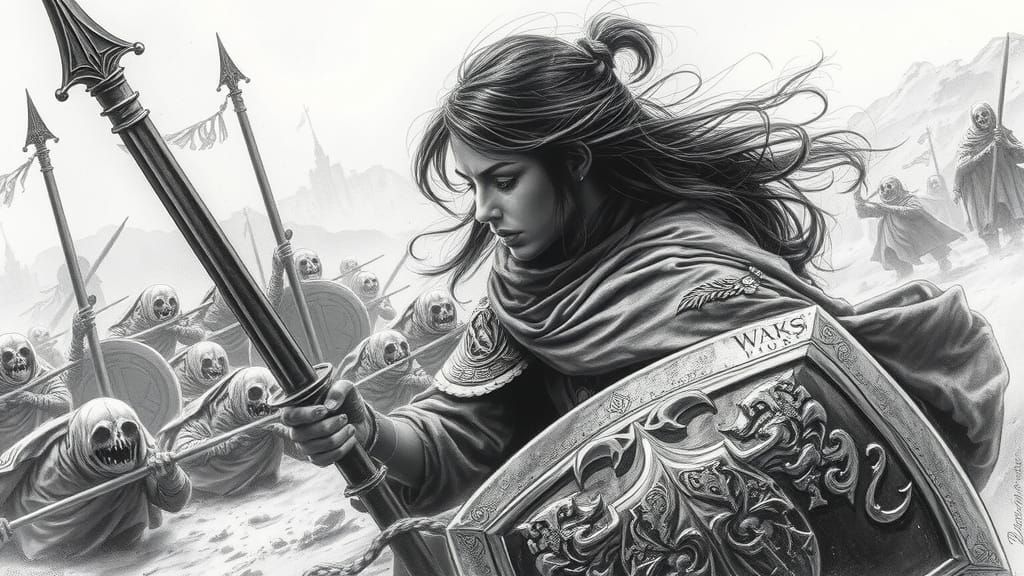This image shows a hyperdetailed charcoal drawing of a female warrior lost in the intensity of battle, capturing a moment of struggle.