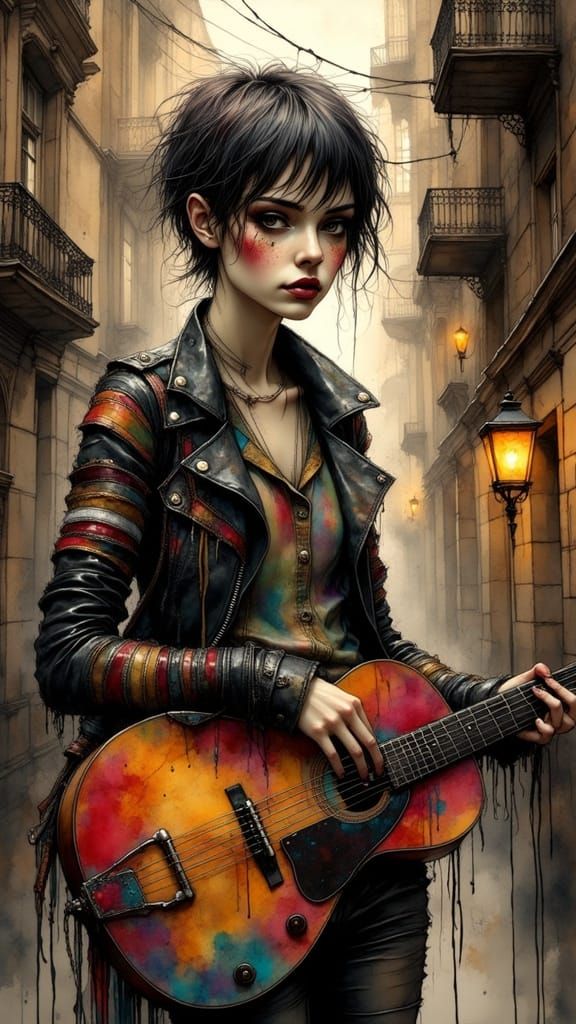 This image shows a confident young woman with short, spiky hair and expressive eyes, standing in a dimly lit alleyway surrounded by Art Nouveau buildings shrouded in mist and smoke. She holds a vintage guitar emitting ethereal fogs and mystical particles, set against a backdrop of intricate, ornate facad...