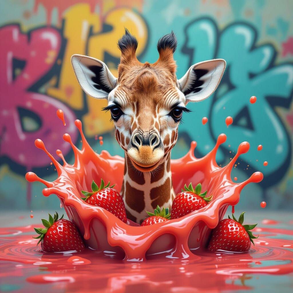 This image features a baby giraffe's head emerging from a vibrant swirl of melting strawberries and colorful graffiti tags, rendered in a dynamic splash art style.