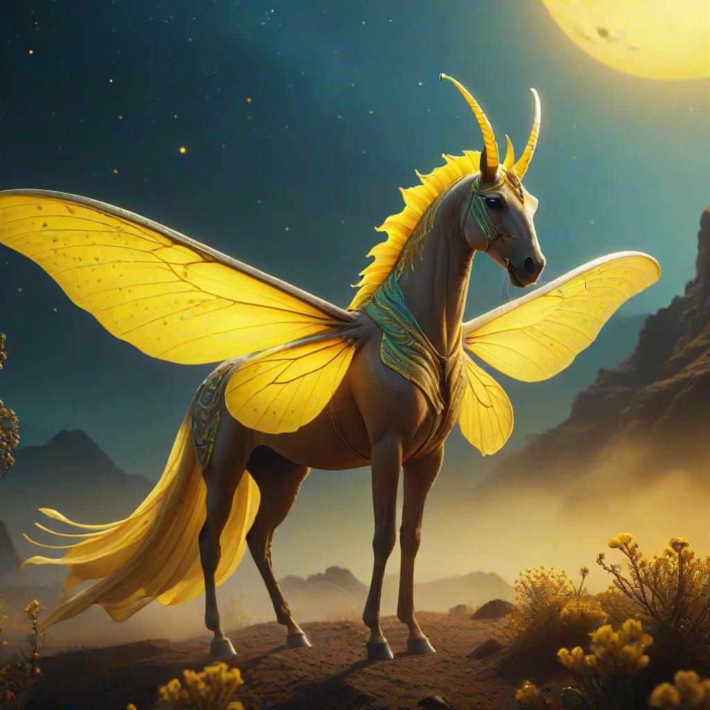 This image shows a striking, regal hybrid creature, part Arabian horse, part comet moth, standing in misty golden light. The digital painting features shimmering iridescent wings and brilliant, vibrant colors.