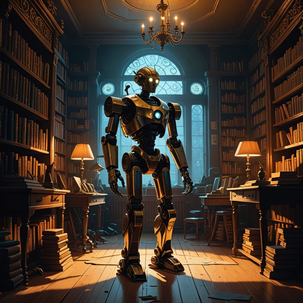 This image shows a humanoid robot in a dimly lit, ornate study, surrounded by ancient books and glowing artifacts, gazing at a holographic human projection with curiosity. The scene is set in a Victorian-era inspired environment with warm golden light and intense colors.