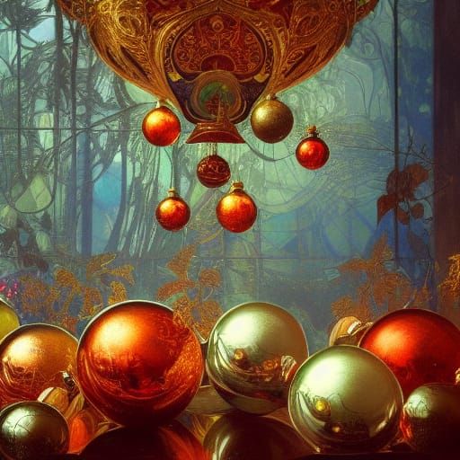 A vibrant composition of Christmas baubles displayed in a glass bowl. This digital artwork features dynamic lighting, intricate detail, and a rich color palette. The piece is reminiscent of art nouveau.