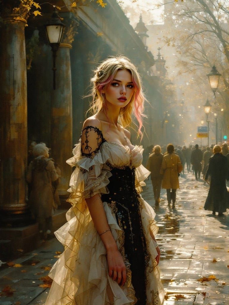 This image features a full-body view of a blonde pin-up woman with pink-tipped hair, standing in a sunbeam. The artwork exhibits atmospheric rim lighting and precise details, characteristic of luminist painting styles.