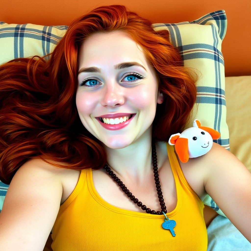 This image shows a serene and inviting portrait of a person relaxing in a comfortable bed, surrounded by warm colors and soft lighting.