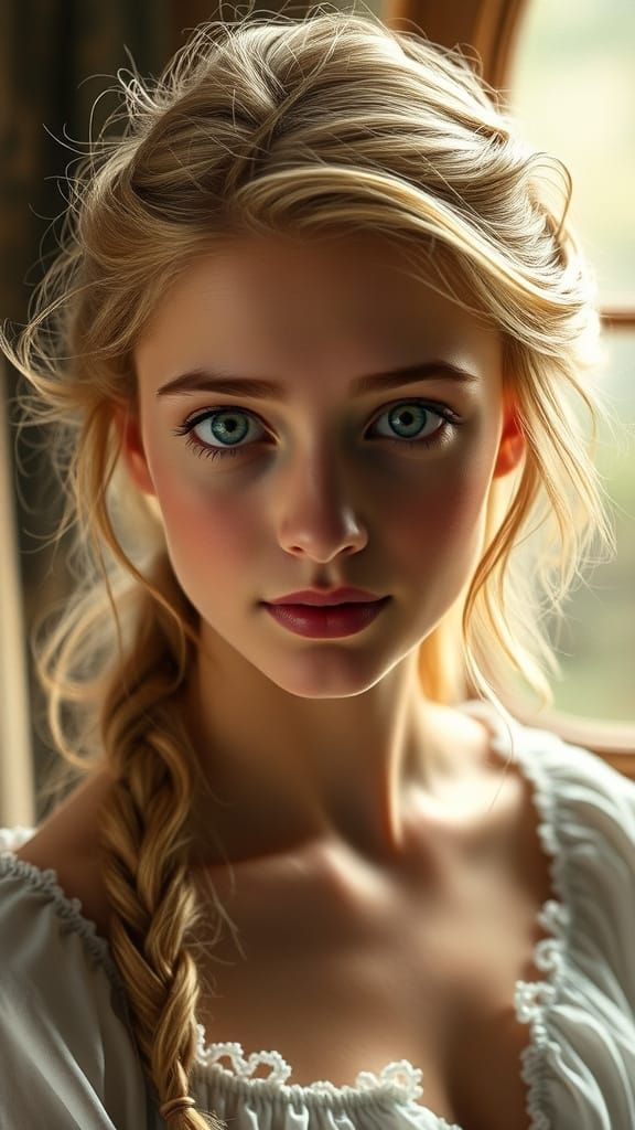 This image depicts a young woman with flaxen hair and feline features set against a warm 18th century English countryside backdrop, evoking the elegance of Rococo and Baroque styles with intricate textures and subtle lighting