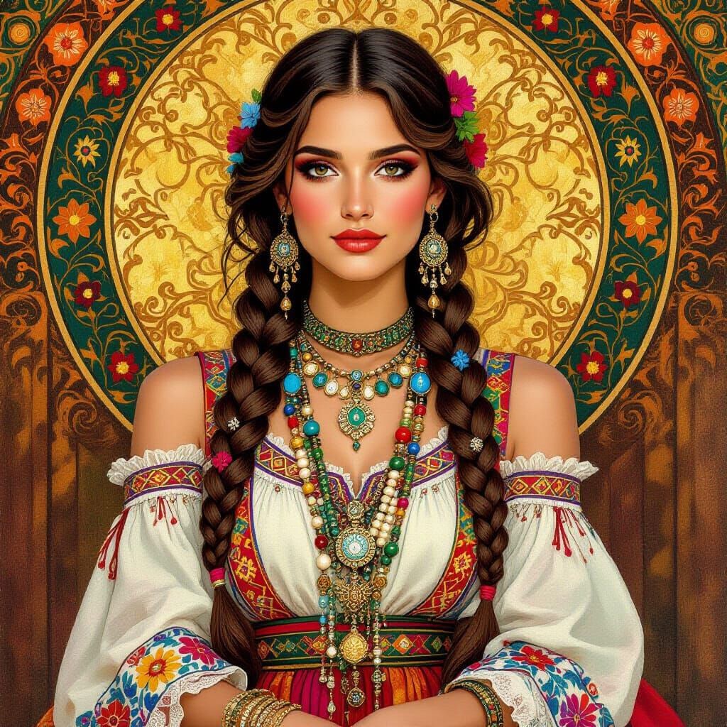 This image shows a woman with braids and jewelry wearing a vibrant dress. The style evokes folk art with ornate and golden accents, reminiscent of expressive portraiture.