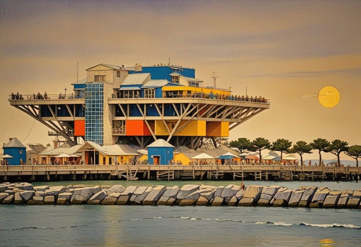 A cartoonish watercolor painting of an old pier in soft pastel colors. Indigo blue and mossy green hues are accented by sunburst yellow-orange. Volumetric lighting showcases whimsical details, inspired by fantasy art.