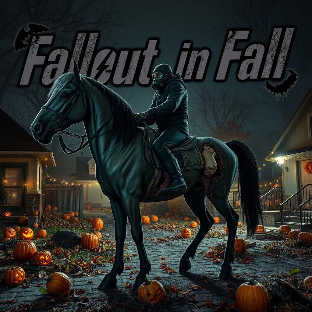 This image depicts a desolate neighborhood after a nuclear event on Halloween. A figure in a hazmat suit rides an undead horse amidst crumbling decorations, with graffiti glowing eerily in the scene, rendered with cinematic post-apocalyptic style.