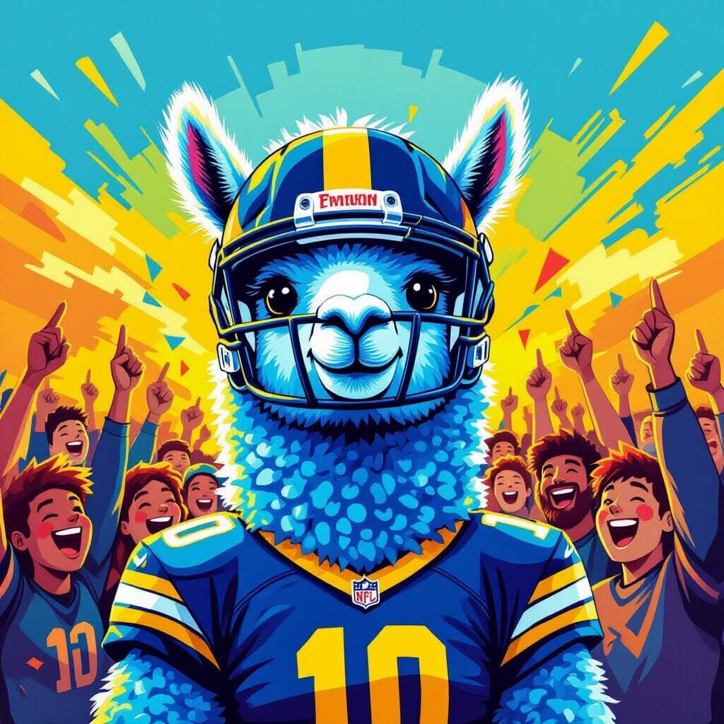 This image shows a cheerful blue and yellow alpaca sporting a football jersey and helmet. The cartoon-style artwork features a jubilant crowd, bold lines, and bright, playful colors.