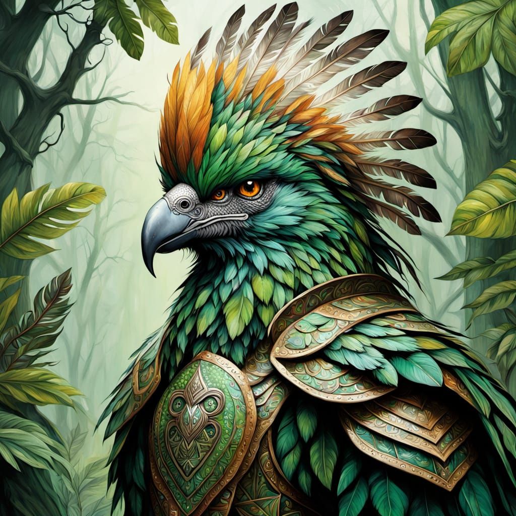 This image shows a majestic Aarakocra warlord standing proudly in a misty jungle, adorned in tribal armor with feathers and talons, set amidst a backdrop of natural environments with earthy tones and vibrant colors, reminiscent of a vivid oil painting.