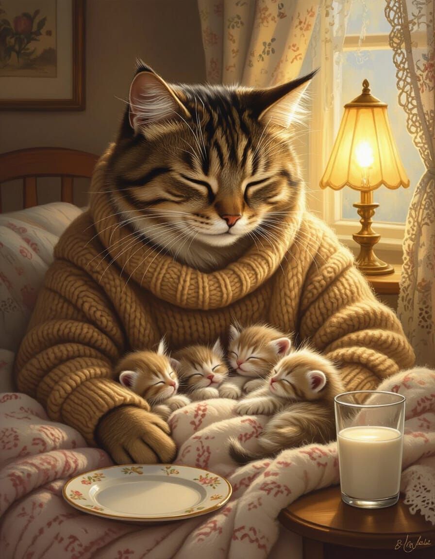 This image shows an anthropomorphic cat mother watching over her sleeping kittens. The scene is filled with soft, warm light and cozy details, reminiscent of classic painterly realism.