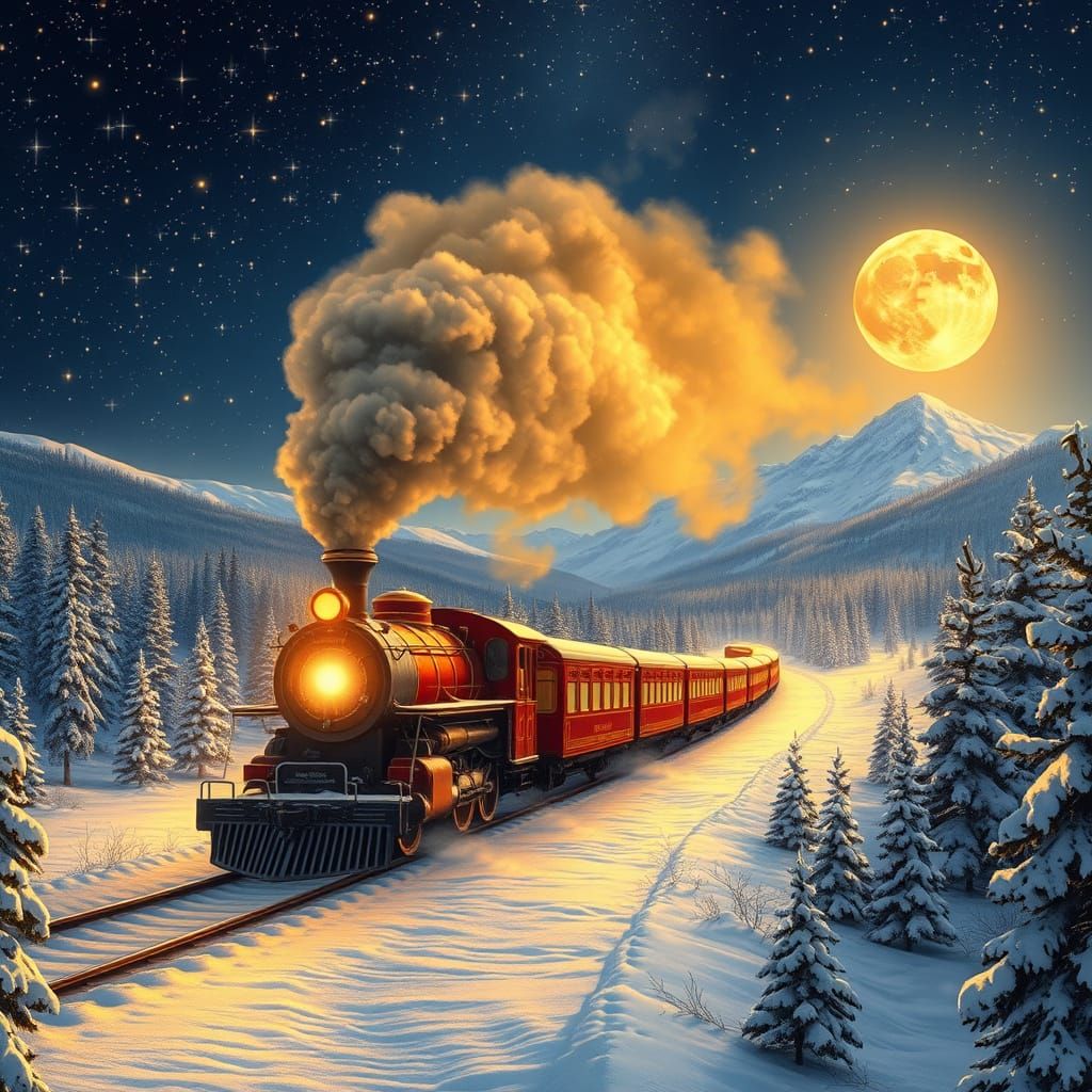 This enchanting image captures a majestic steam train speeding through a serene snow-covered wilderness under a full harvest moon, with golden light and shooting stars filling the starry sky, as delicate snowflakes gently fall, blanketing the forest in a thick layer of powdery snow, in the style of a dre...