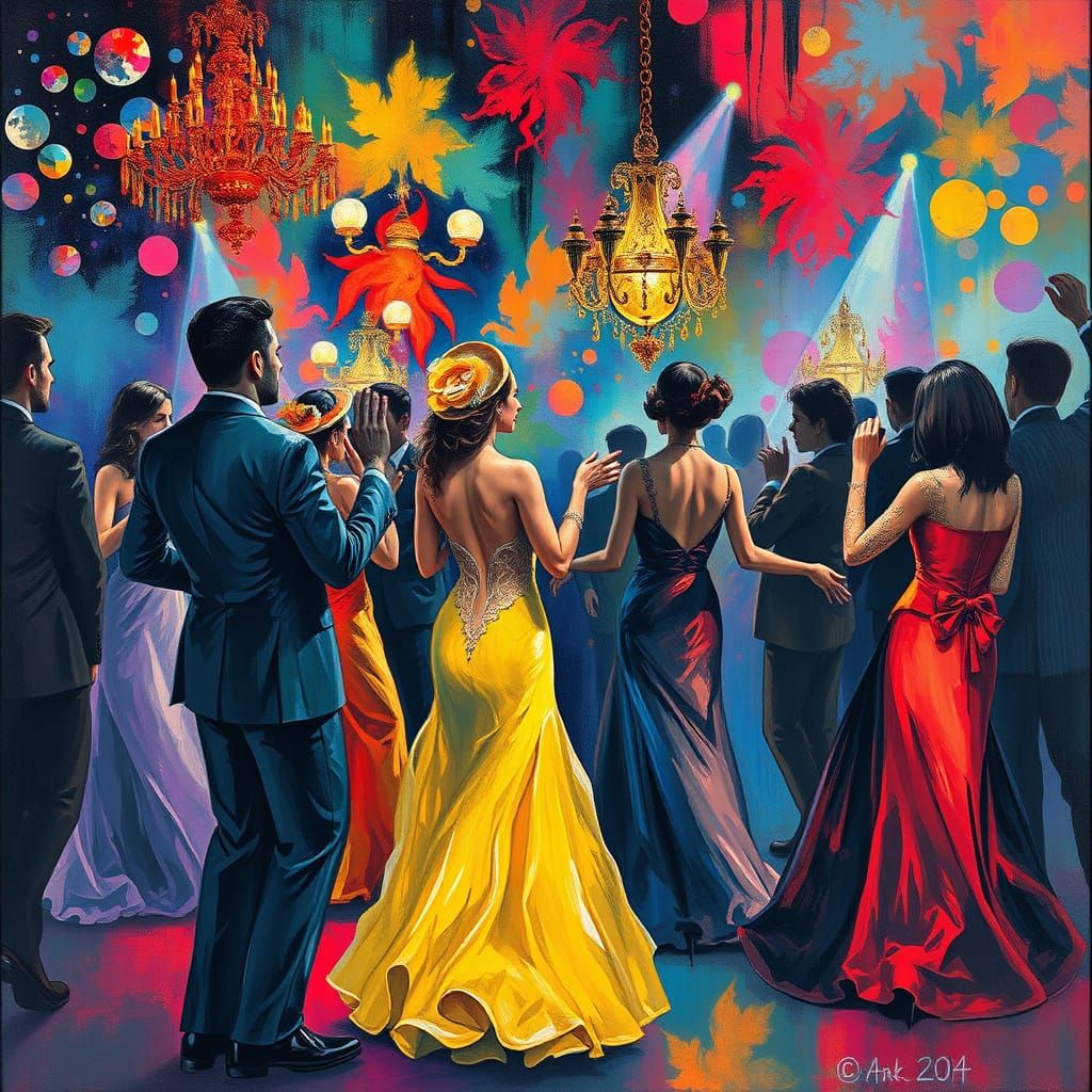 A vibrant party scene filled with dancing figures in elaborate costumes. The image is a high-resolution charcoal drawing with watercolor and gouache elements, reminiscent of impressionist paintings with side lighting.