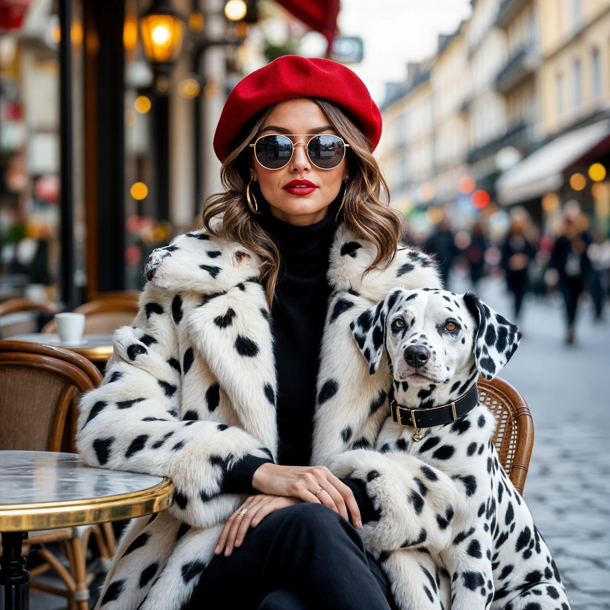 A chic woman in a dalmatian-print coat and red beret sits with her dog at a European cafe. The image features a vibrant, painterly style with soft brushstrokes.