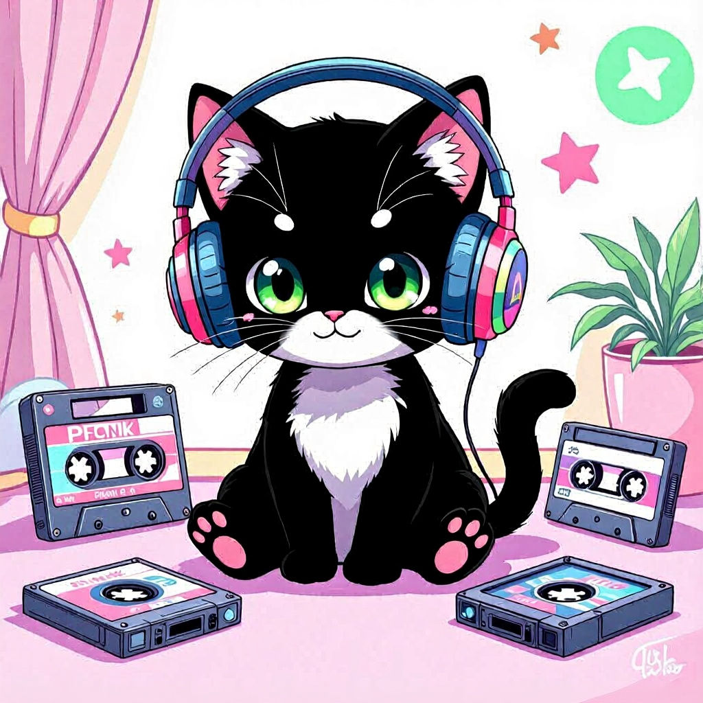 This image shows a cute black chibi cat with green eyes and headphones, enjoying phonk music in a pastel room. The art style combines bold lines, vibrant colors, and digital and watercolor textures.