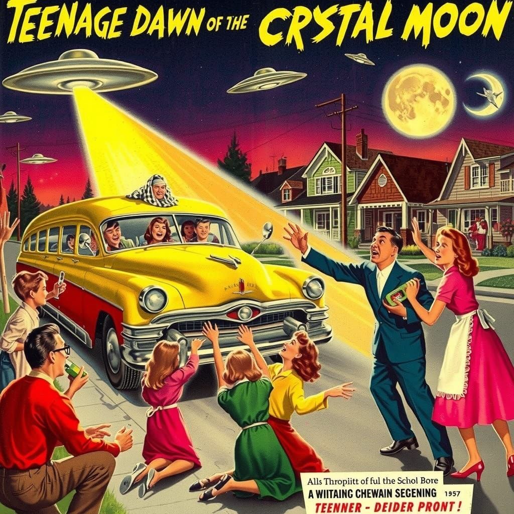 “TEENAGE DAWN OF THE CRYSTAL MOON" (1957) A suburban street at twilight, flying saucer beams vacuuming up a yellow ‘50s school bus that’s filled with screaming teenagers. Mothers in aprons pointing screaming at the sky. A square-jawed scientist (in horn-rims) clutching a Geiger counter. Technicolor meets B-movie pulp. Think War of the Worlds meets The Blob.