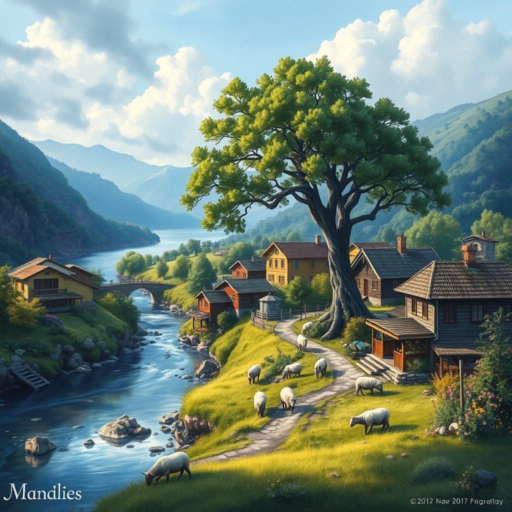 A vibrant watercolor image of a rural village in the Americas. Colorful houses and lush greenery surround a serene river with grazing sheep, all rendered in a wet watercolor style.