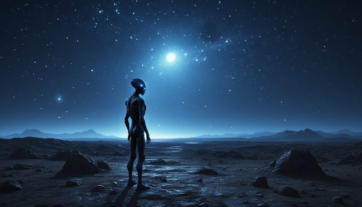 This striking image shows a grey alien in a desolate landscape, its large eyes reflecting stars. Created as surreal science fiction concept art with deep blues and purples.