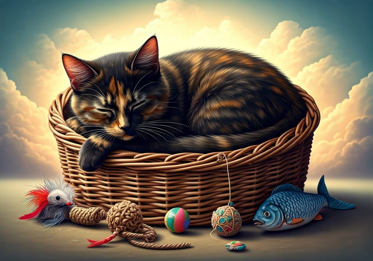 A beautiful tortoiseshell cat sleeps peacefully in a wicker basket. Cat toys surround it against a heavenly cloud background. The image is reminiscent of classic natural history illustrations.