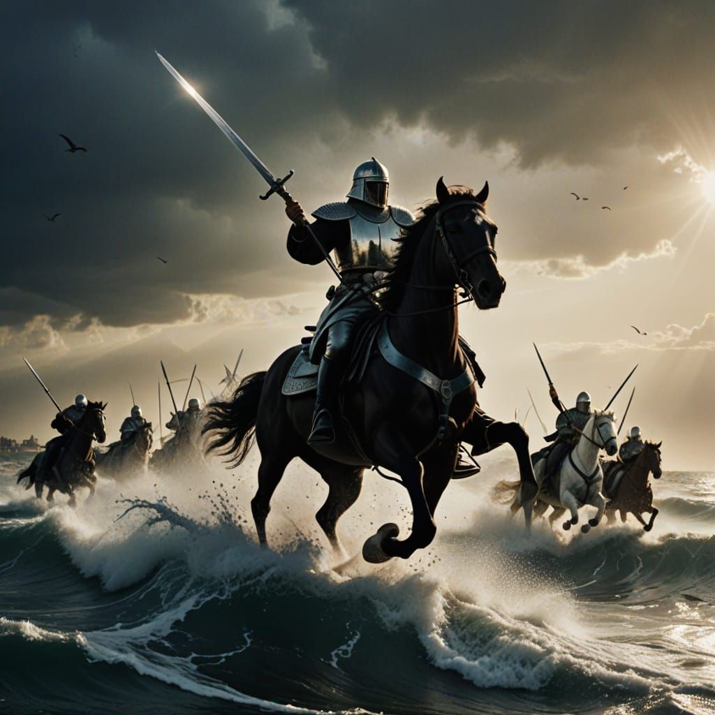 This image depicts a dramatic apocalyptic scene inspired by the Seventh Seal, featuring angels with powerful swords battling the IDF in Israel. It's rendered with cinematic lighting and film grain for a striking visual.