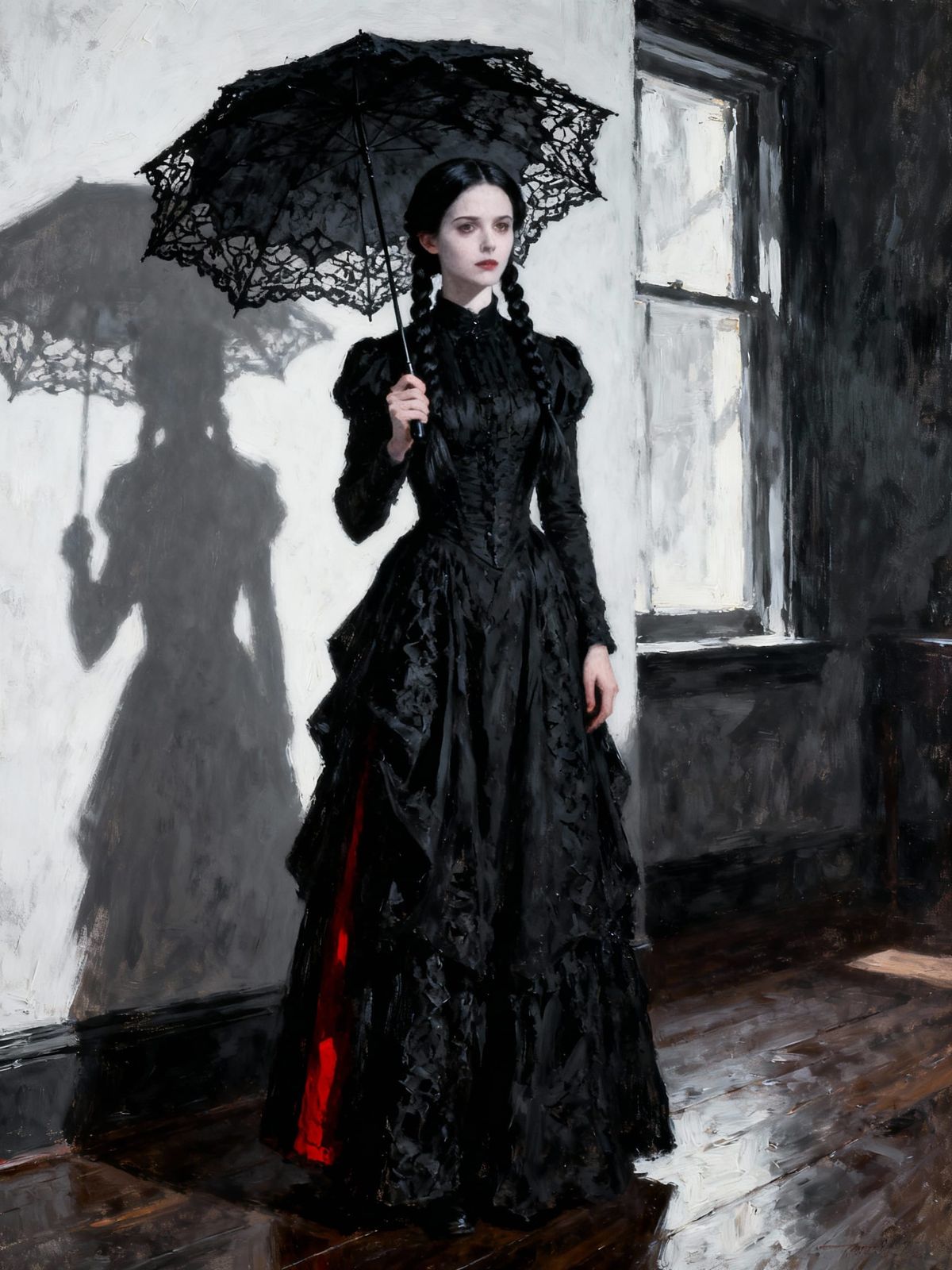 This highly detailed oil painting shows a full body portrait of Wednesday Adams holding a black lace parasol with dramatic, cinematic lighting and a textured finish.