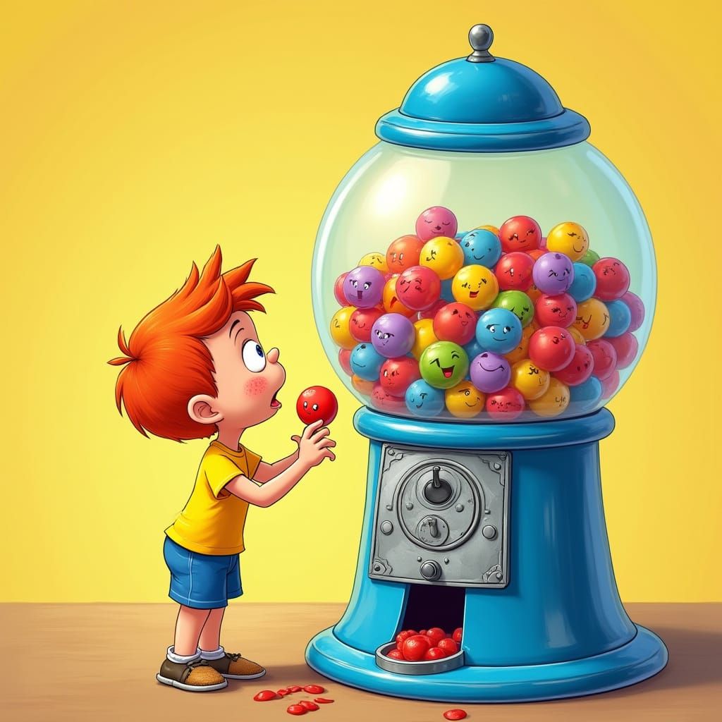 This vibrant illustration shows a whimsical gumball machine in a sunny backyard, filled with a rainbow of gumballs, each with its own unique facial expression. A curious little boy with bright red hair reaches up to select a gumball, in a style reminiscent of classic cartoons with bold lines and dynamic ...
