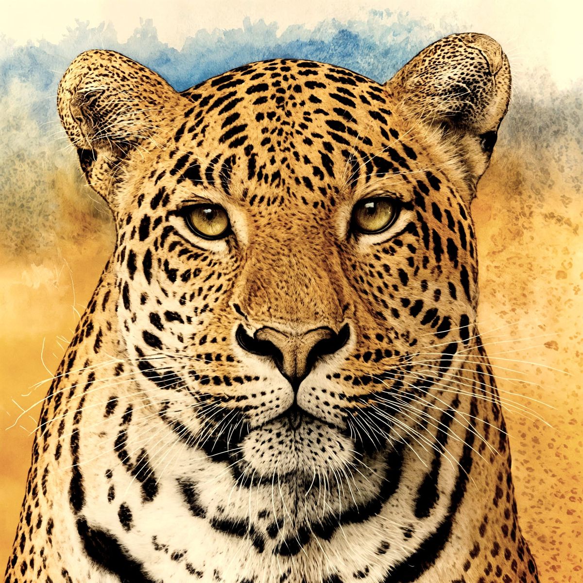 This image shows a photorealistic painting of a leopard's face, created in a watercolor style with delicate details and a serene atmosphere