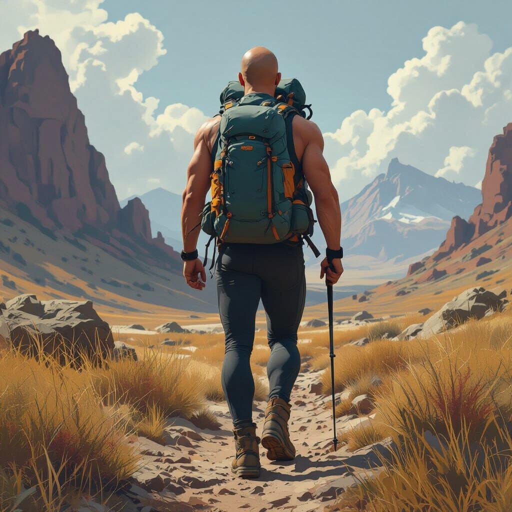 A rugged landscape features a muscular, bald, 50-year-old male hiker in tight leggings. The image features atmospheric lighting and vibrant earthy tones in a retro-futuristic style.