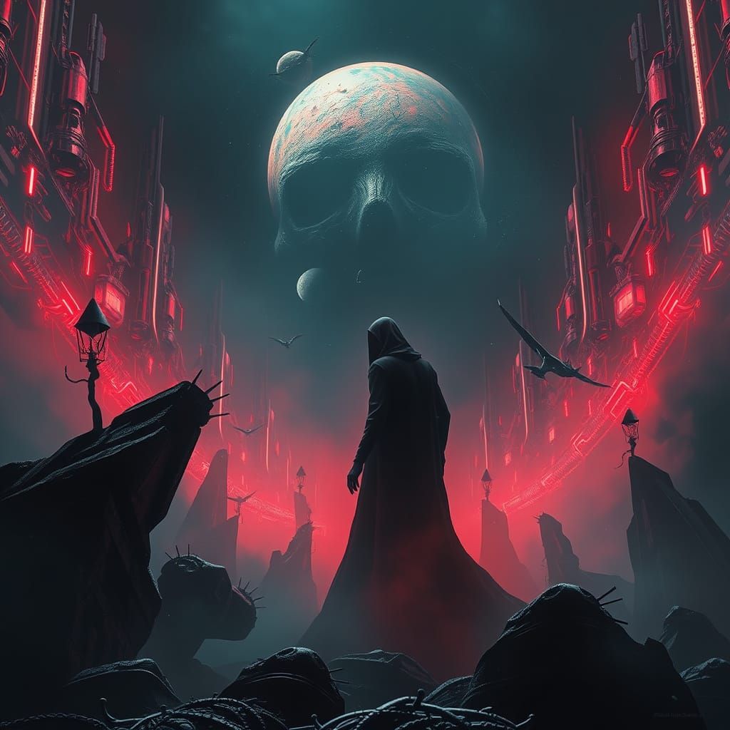 This image shows a dark, ominous figure lost in a haunting, surreal dreamscape. It is rendered in a biomechanical style with elements of haunting realism and futuristic neon aesthetics.