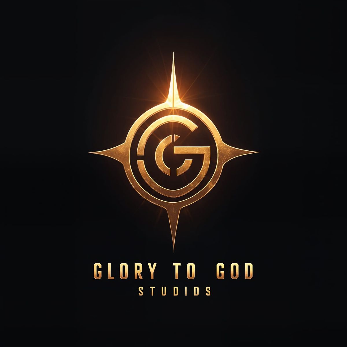 A futuristic logo design for Glory to God Studios featuring bold lines, metallic colors, and a glowing aura. The logo evokes a strong, contemporary aesthetic.